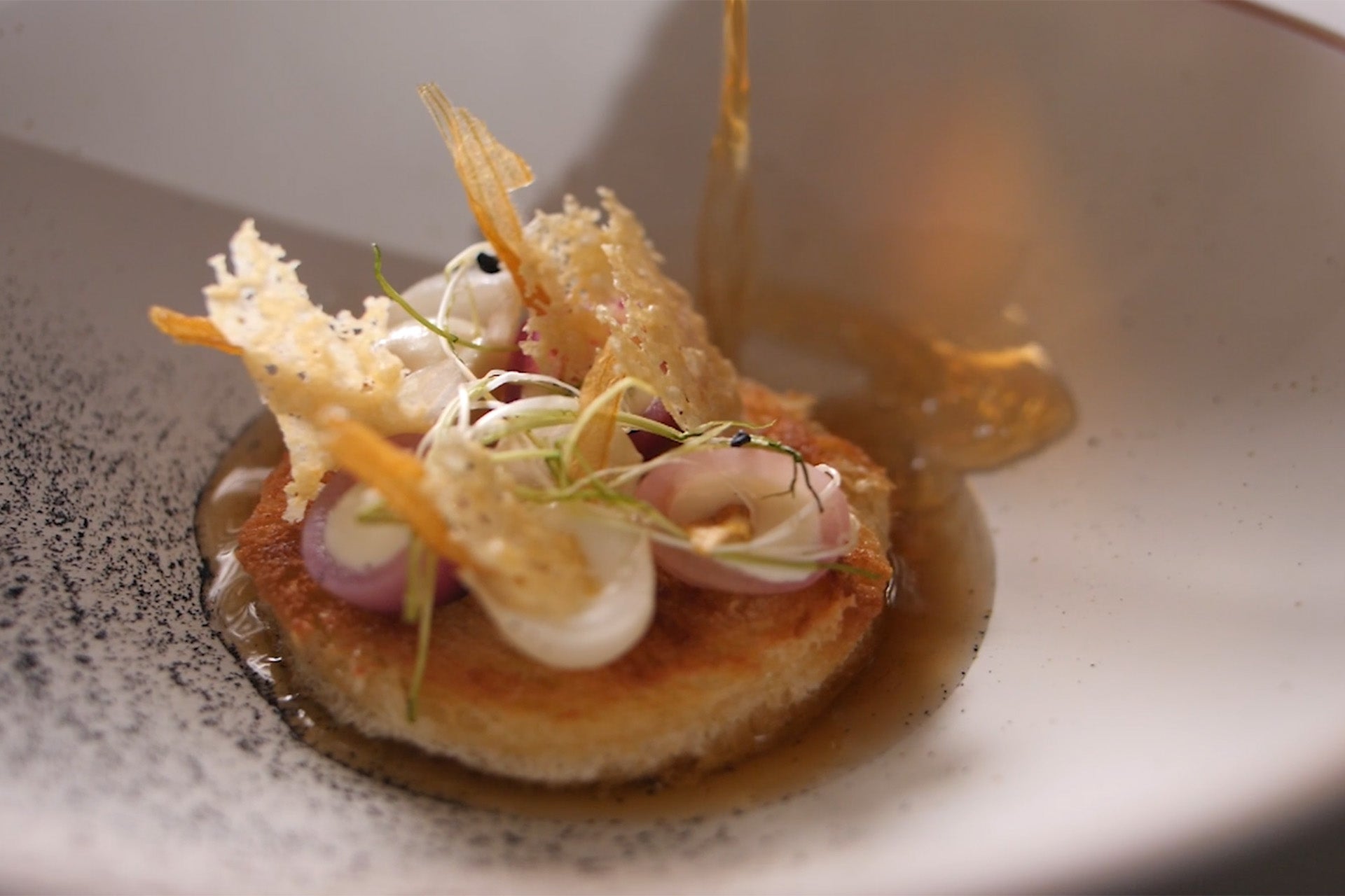 Garnish with some onion chips and onion cress. Add some pieces of comté chips.