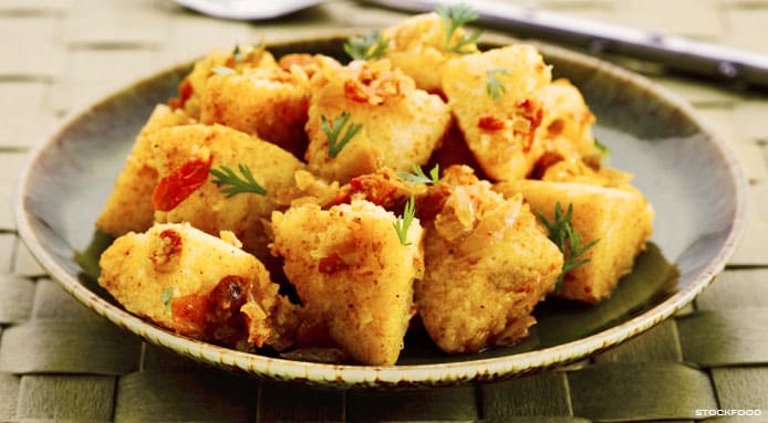 Indian rice cakes with mustard seeds, chana, carrots, raisins and coconut, garnished with coriander.