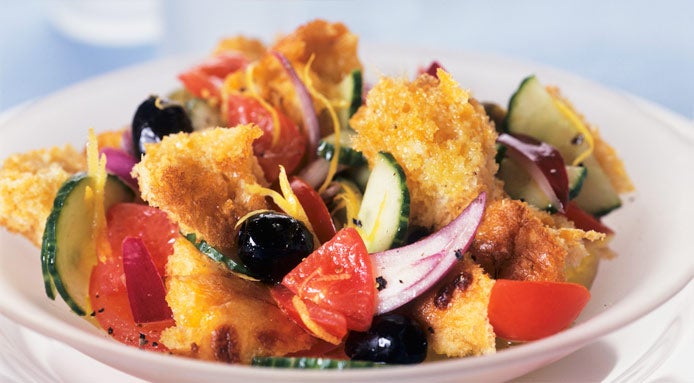 Stale bread gets a tasty makeover in this classic Italian salad. Yesterday’s bread is mixed with tomatoes, onions, cucumber and plenty of olive oil.