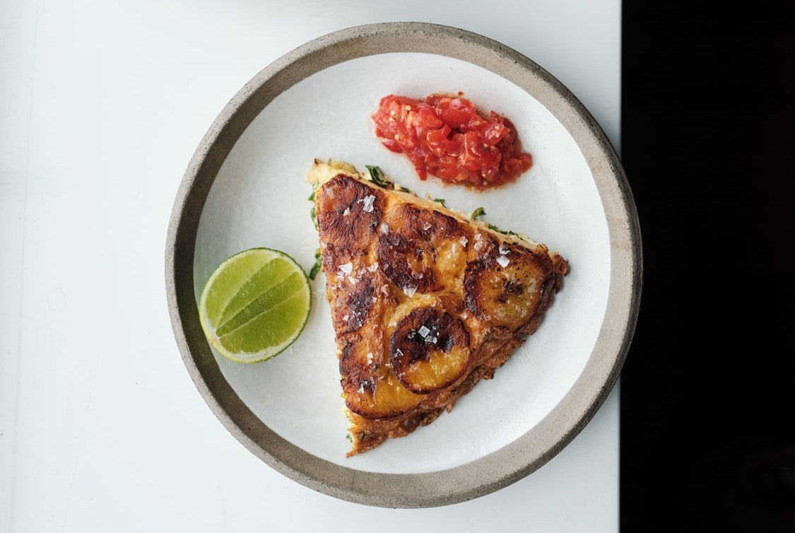 Place a large plate on top of the pan, then quickly flip the whole thing over so the omelette ends up on the plate. Hopefully all the plantain pieces will end up on the omelette, but if not just peel them from the pan and place them back on top.