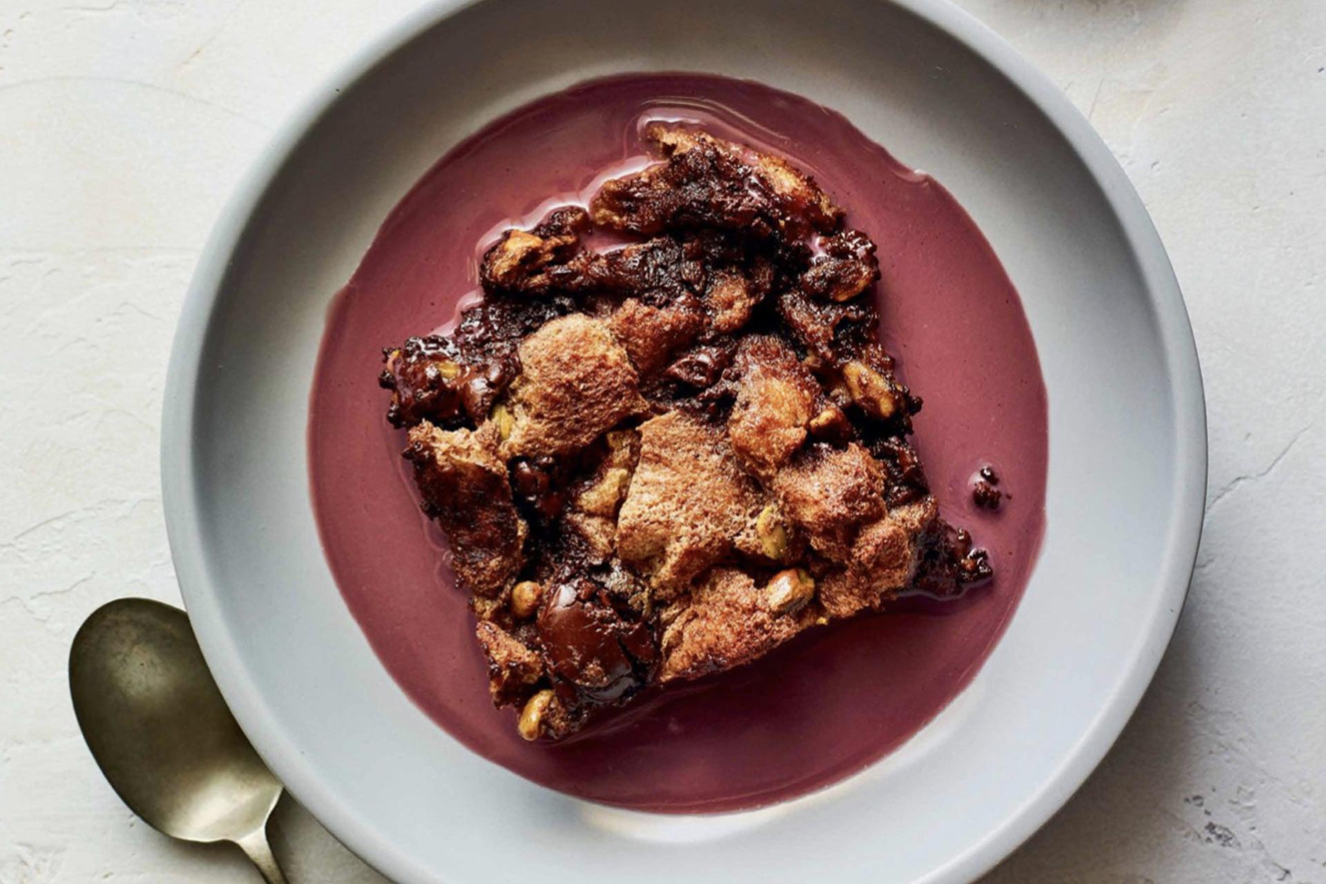 When the bread is completely softened, add the butter, chocolate, bourbon, and pistachios, if using. Stir well. Transfer the mixture to the prepared pan. Bake, uncovered, for 45 minutes, or until the center of the bread pudding is just set. The surface should be browned and firm to the touch with a bit of give. When you lightly press in the center, no liquid should rise to the surface.