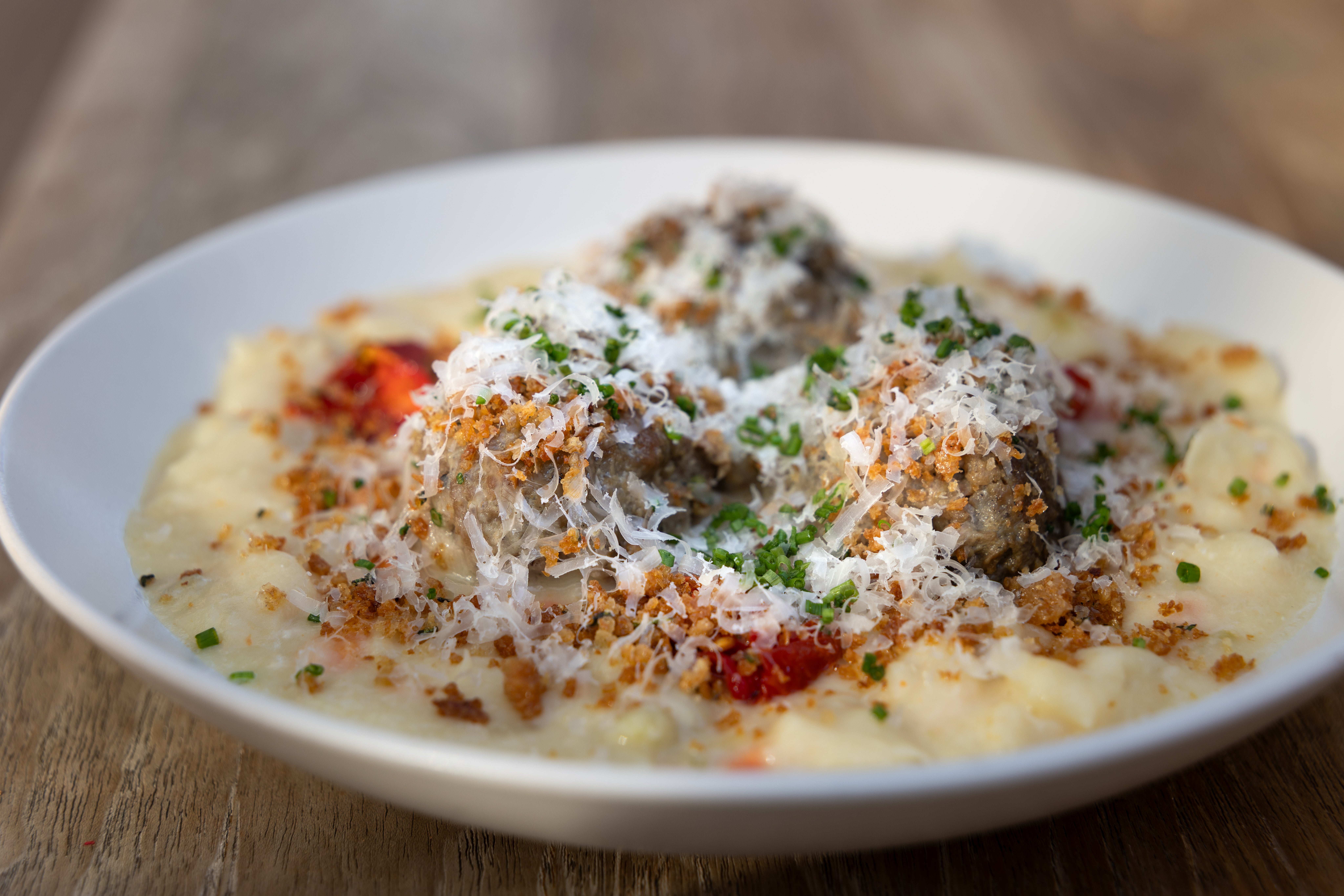 - Finish with chopped chives, microplaned lemon zest, rosemary breadcrumbs, olive oil, grated pecorino, and coarsely ground black pepper.