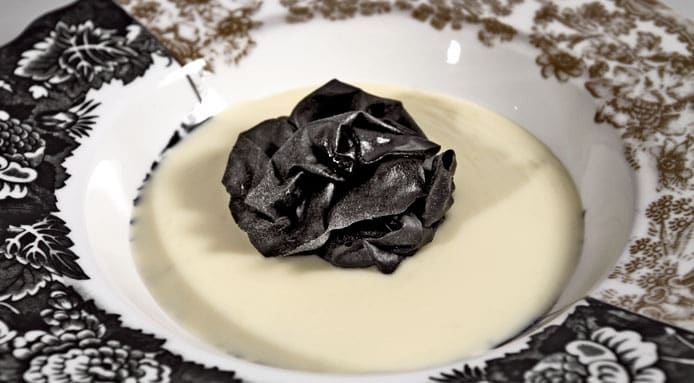 Mix the flour, oil, egg yolks, water and squid ink for 10 minutes. Using a pasta machine, roll out thin sheets of dough.