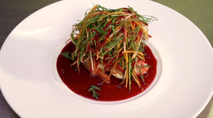 An elegant lobster salad over beetroot sauce and garnished with vegetables, carrots, rocket salad, and zucchini