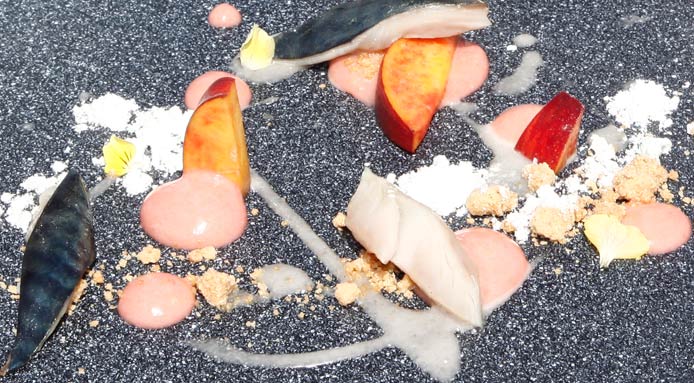 Mackerel, Peach, Almond, Buerre Noisette by Shaun Anthony