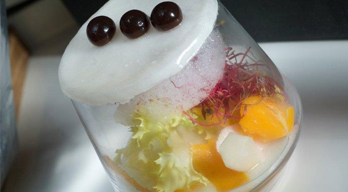 - At the bottom of a glass, place the potato foam, the sliced eggs, the tuna roe filets, the lettuce and sprouts, the olive air and, lastly, the anchovy filets.