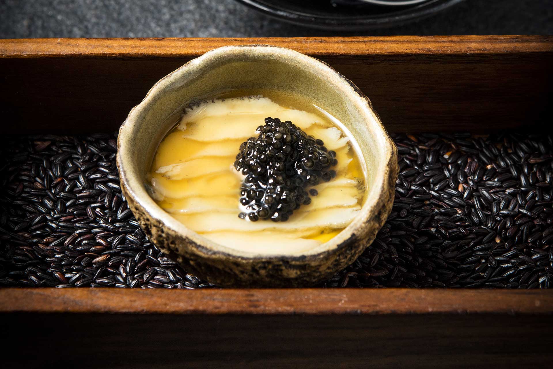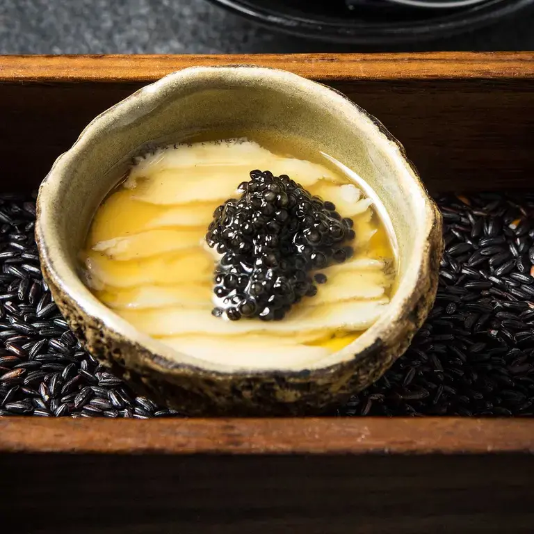 Layer the sliced abalone onto the chawanmushi (egg custard) to order, warm under the salamander of the top grill of an oven.