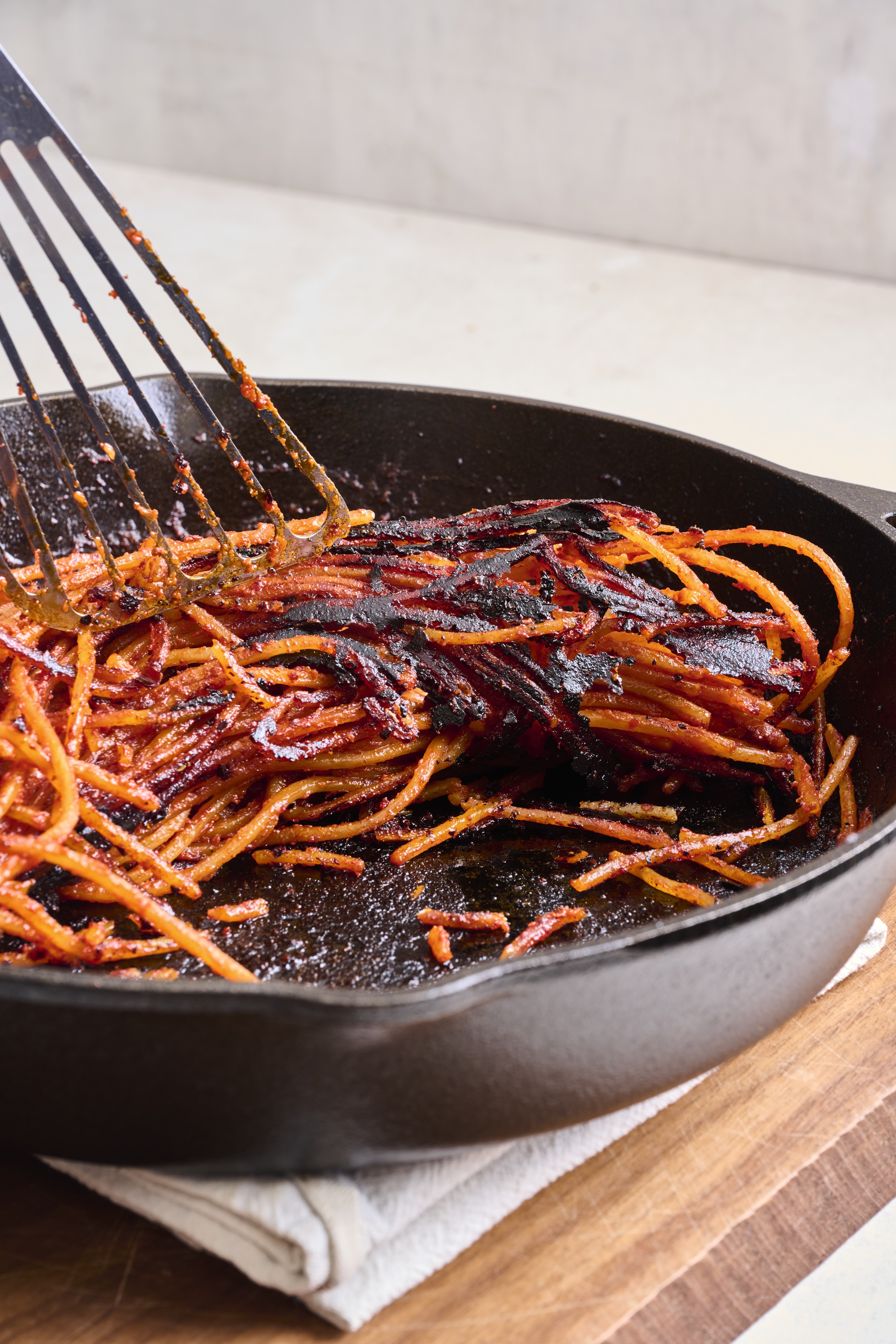 Forget everything you know about making pasta here: The pasta is cooked in a nearly dry pan to start, and you want to bring the strands right to the edge of burning to get some strong caramelization on the bottom of the pan. Once you've got that caramelization going, you cook it more like a risotto than a pasta, adding ladlesful of tomato-tinged water a bit at a time until the pasta is tender. You need to watch the pasta carefully (don't walk away from it!), but the result is so full of flavor. Although it is not traditional and optional for those who haven't yet boarded the tinned fish train, I like to add canned sardines just before plating for a bit of protein—and all those Super-Italian nutrients. Oh, and the name? Its origins are a bit unclear, but I do know that this pasta slays every time!