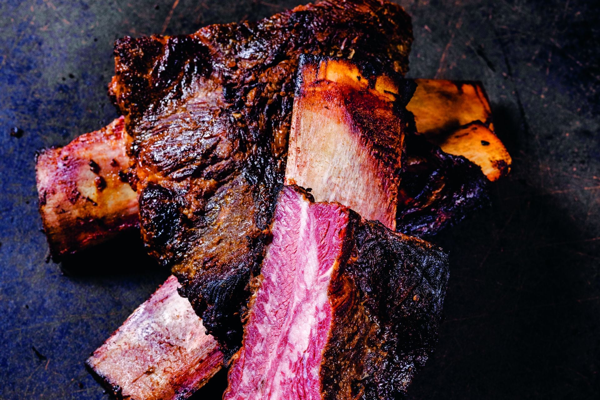 Use tongs to transfer the ribs to a sheet pan, tent the ribs loosely with foil, and let rest at room temperature for 30 to 45 minutes. Slice the rack into individual bones and trim off and chop any meat alongside the ribs so each rib is easy to pick up and eat. Arrange the ribs and chopped beef on a large platter and serve.