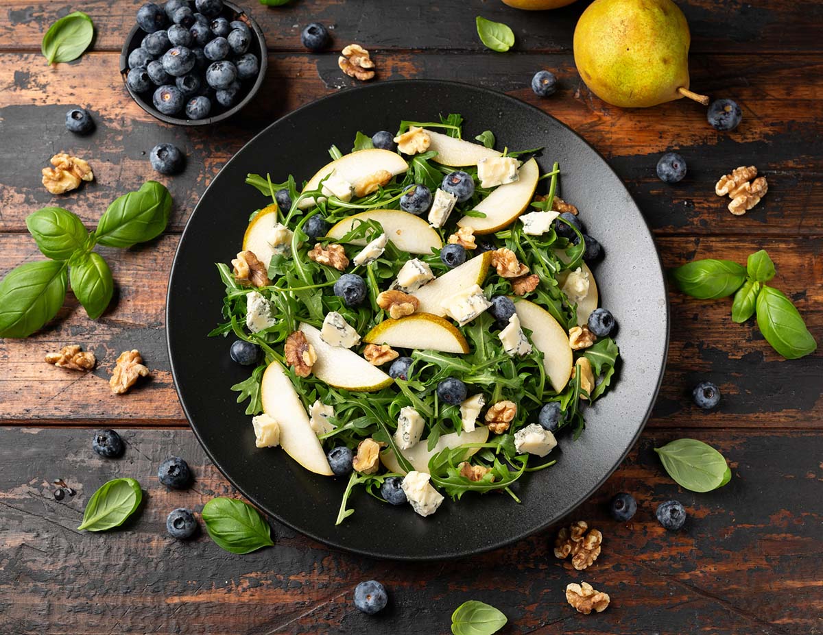 If preferred, you can substitute the arugula for other greens. Varieties, such as baby spinach, also work well in this recipe and pairs neatly with the richness of the Gorgonzola. However, we like the peppery notes that arugula adds to the mix with the creamy, saltiness of the cheese and sweetness of the pear. Some chefs will also build in other classic salad elements, such as radicchio, to add complexity and depth of flavor to the dish.