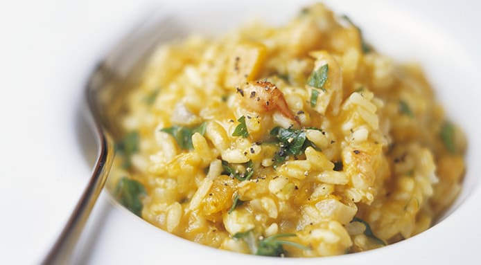 Pumpkin and Prawn risotto recipe is a creamy dish perfect to heat up a cold autumn day: learn how to make a delicious risotto with these ingredients.