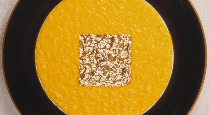 Italian chef Gualtiero Marchesi's signature dish: a traditional Milanese saffron risotto made adding a pretious golden leaf at the end
