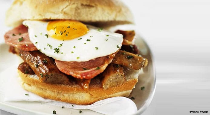 Sandwich with bacon, sausages and fried eggs on bread rolls quick to make with this recipe.