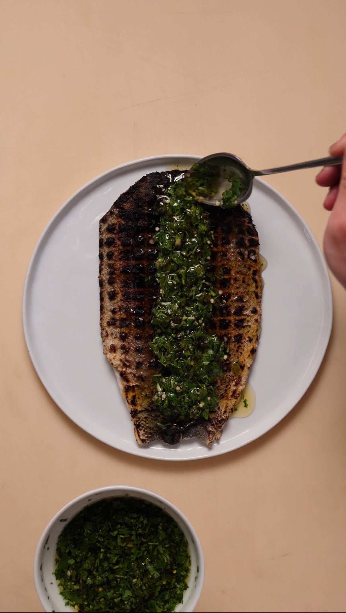 A bright, smoky chimichurri made with blistered shishito peppers, fresh herbs, serrano, capers, and distilled vinegar. Perfect with grilled vegetables, fish, or steak.