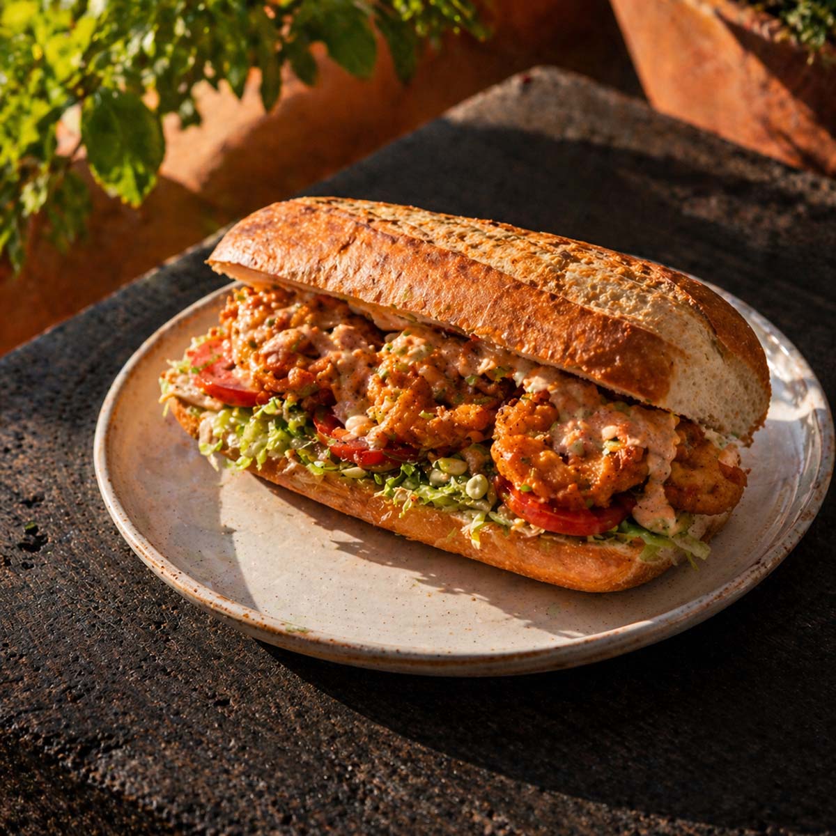 The remoulade sauce is the key to the flavors of a po’ boy. A mixture of mayonnaise, mustard, hot sauce, garlic, and paprika, it’s a tangy, spicy, and creamy addition to the sandwich. A dash of freshly squeezed lemon brightens the sauce.