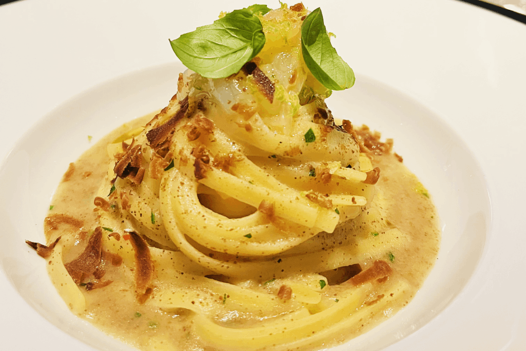 Present the spaghetti like a nest on a soup plate. Complete the recipe by adding the raw langoustines previously seasoned with oil and lime zest. Finish the dish by adding a basil leaf.