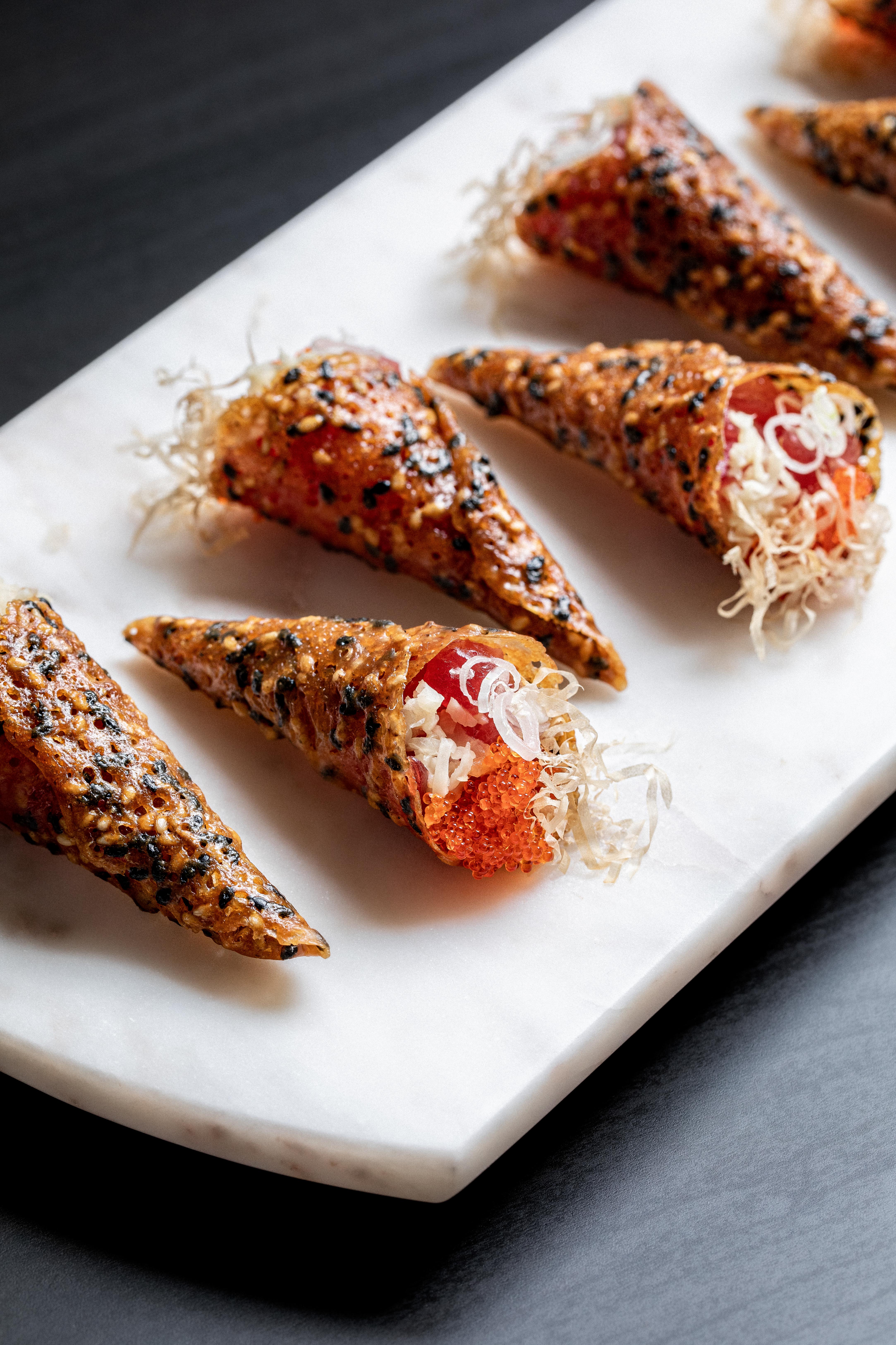 A signature Wolfgang Puck Oscars dish, this spicy tuna tartare is served in delicate sesame miso cones, combining bold flavors with an elegant bite.