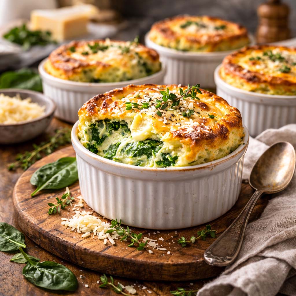 Nutmeg is another classic ingredient to complement the spinach. If you want to introduce other flavor dimensions, try topping your spinach soufflé with chopped chives or incorporate a dash of thyme into the mixture for extra freshness.