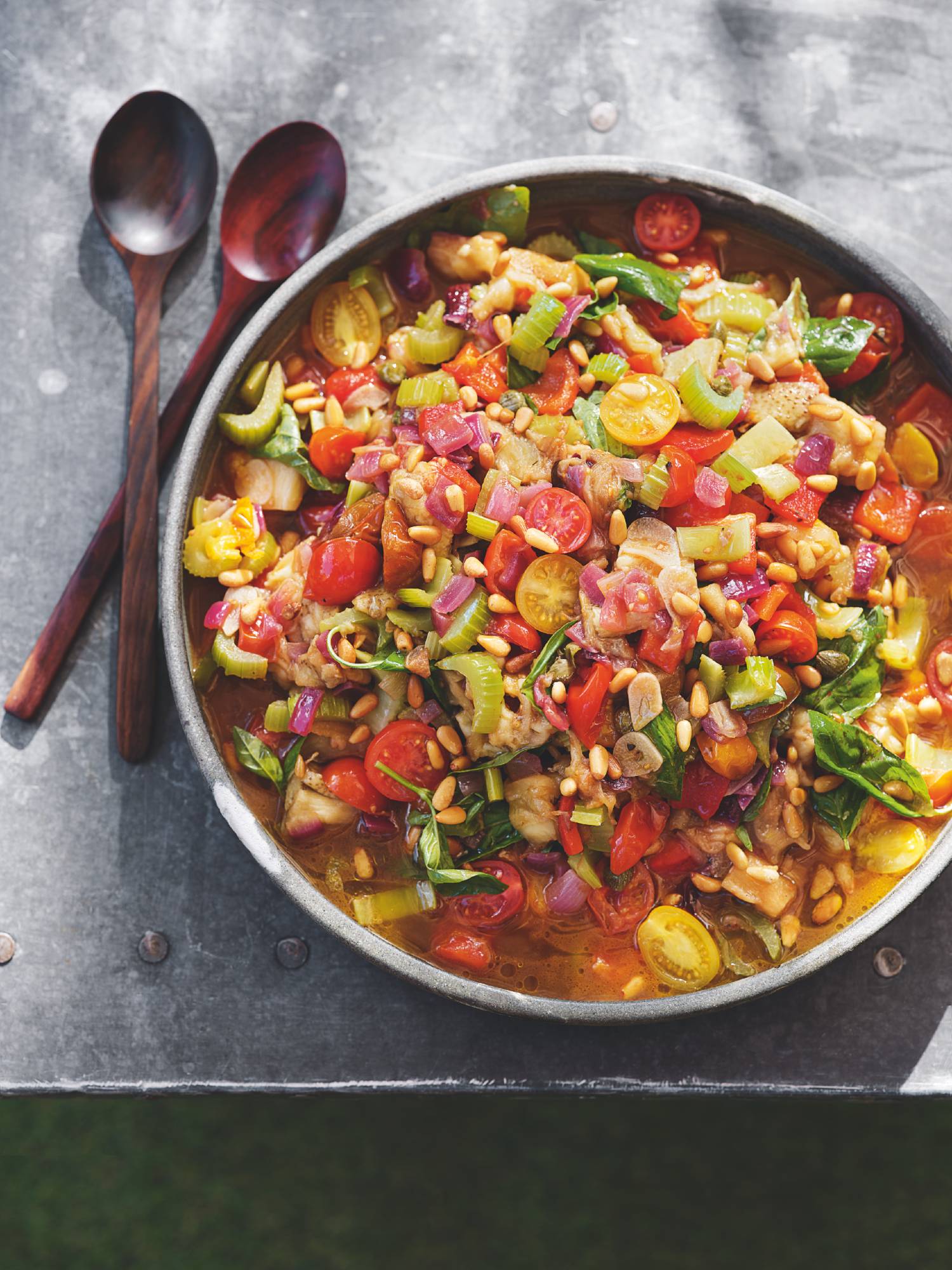 Red peppers and aubergines become intensely smoky and delicious when they’re cooked whole on the barbecue. For this Mediterranean side by chef Tom Kerridge, they’re combined with garlic, red onion and capers, and topped with basil and pine nuts. It works well with fish, lamb or chicken.