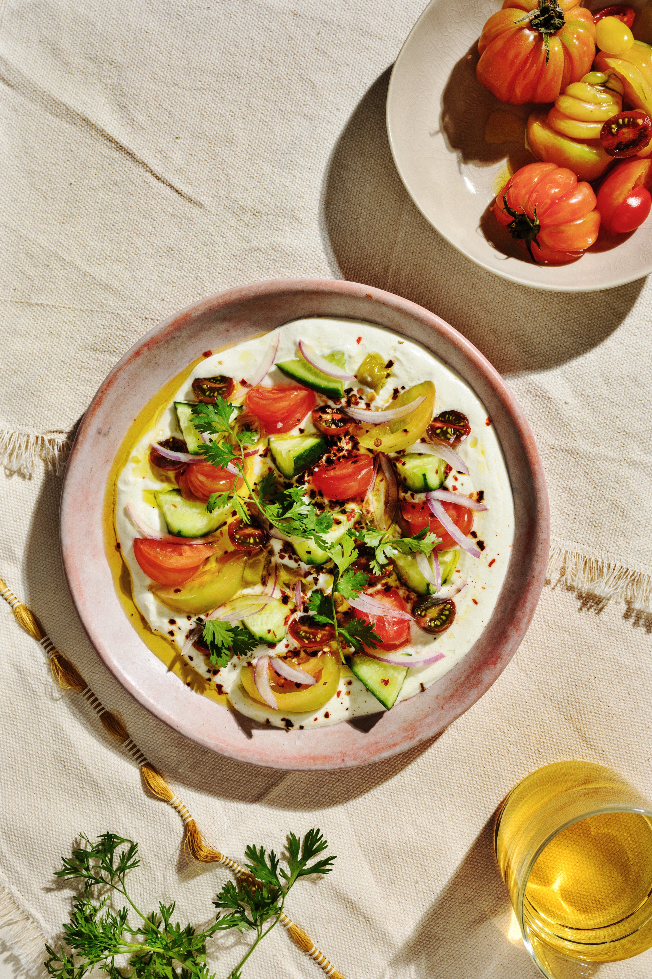 Chef and cookbook author Jodi Moreno’s semi-deconstructed nod to the classic Greek salad: cool peak-summer vegetables piled over a cloud of whipped feta—simple, refreshing, and ridiculously good.
