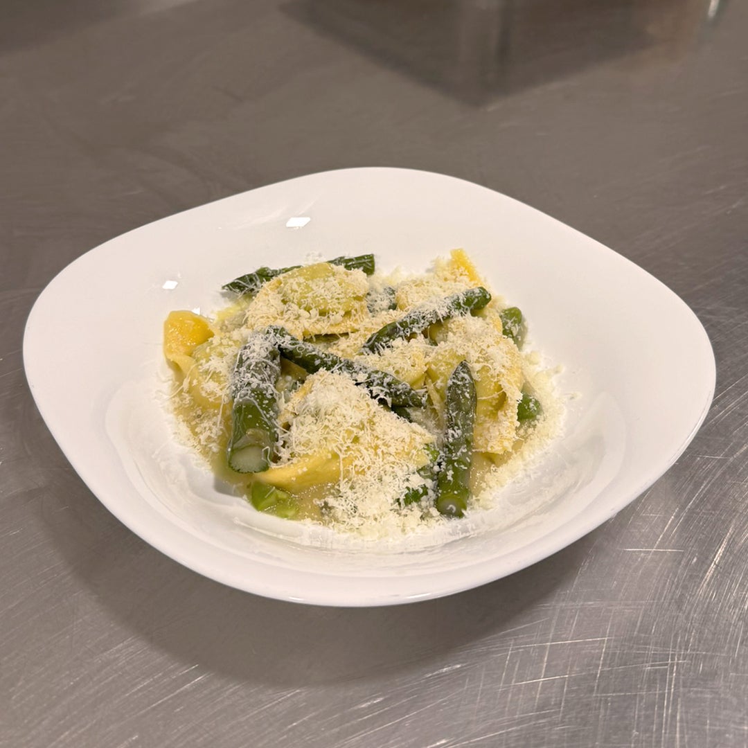 Cut the asparagus stalks into rounds and sauté them in a skillet with a drizzle of oil, salt, and pepper. After 6–7 minutes of cooking, blend them with the ricotta and grated Parmesan. Adjust seasoning with salt, pepper, and, if you like, a pinch of nutmeg. Keep the filling in the refrigerator until ready to use.
