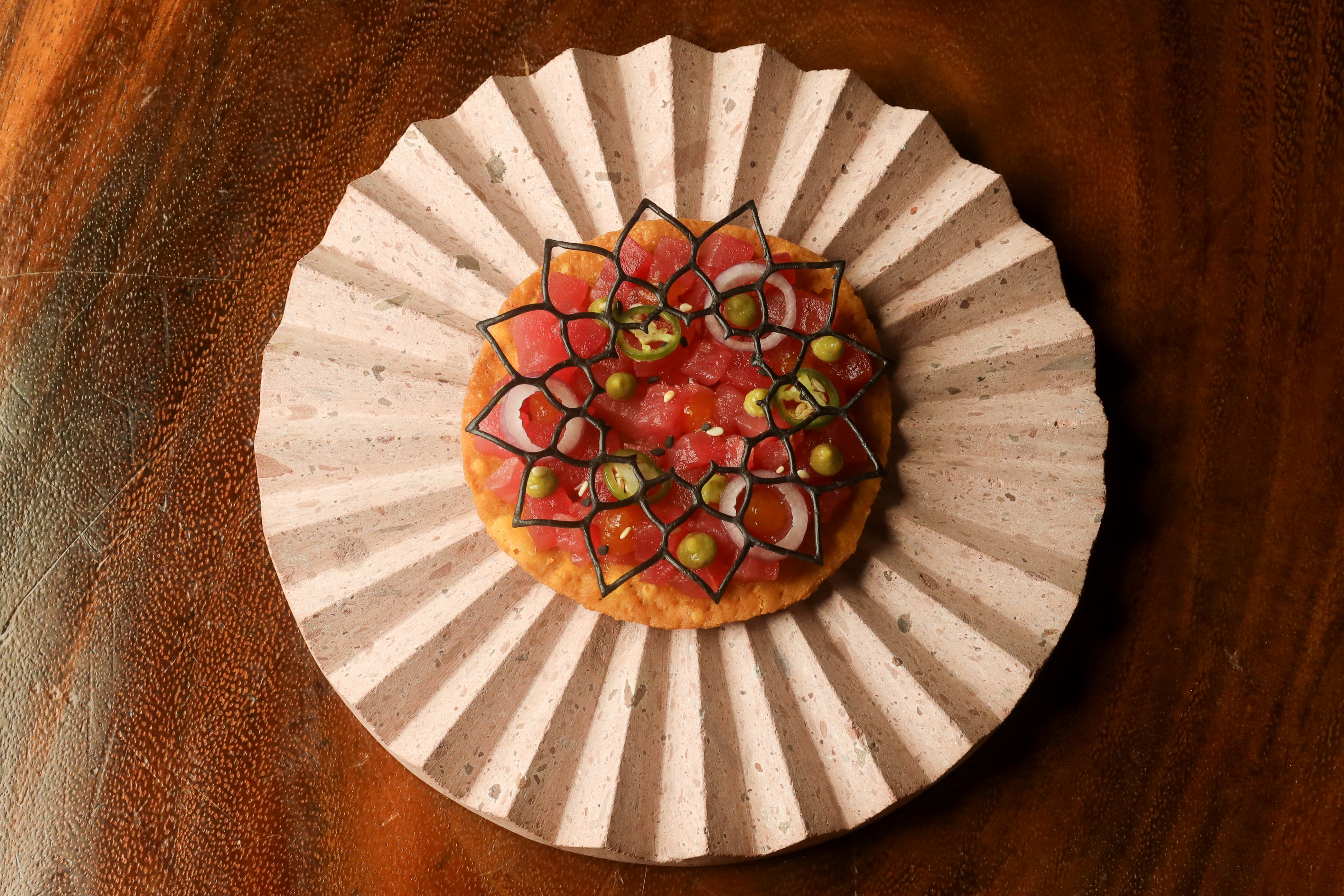 Chef Mayank Istwal’s Tuna Masala Papad layers avocado, chutney, and spice-marinated tuna on a crisp papad, blending coastal Indian flavors with modern technique for a vibrant, textural bite.