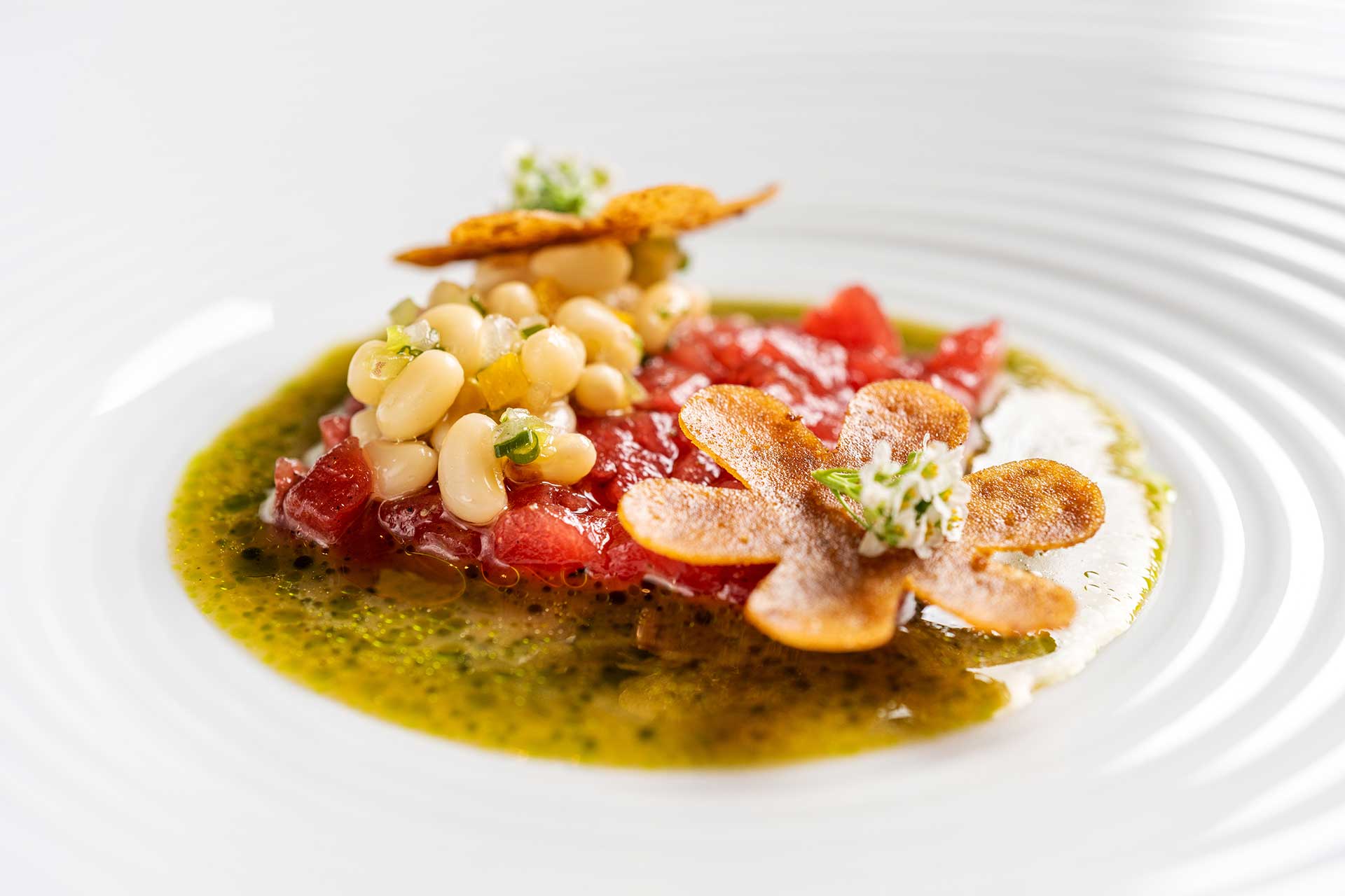 Remove the fibres from the tuna meat, cut into small dices and season it with olive oil, Maldon salt and black pepper.