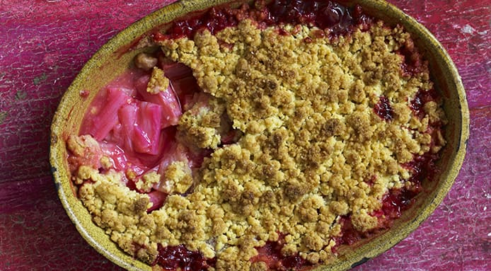 Try this rhubarb crumble recipe, a great classic of British cuisine: this version is vegan, so no milk and eggs in the recipe.