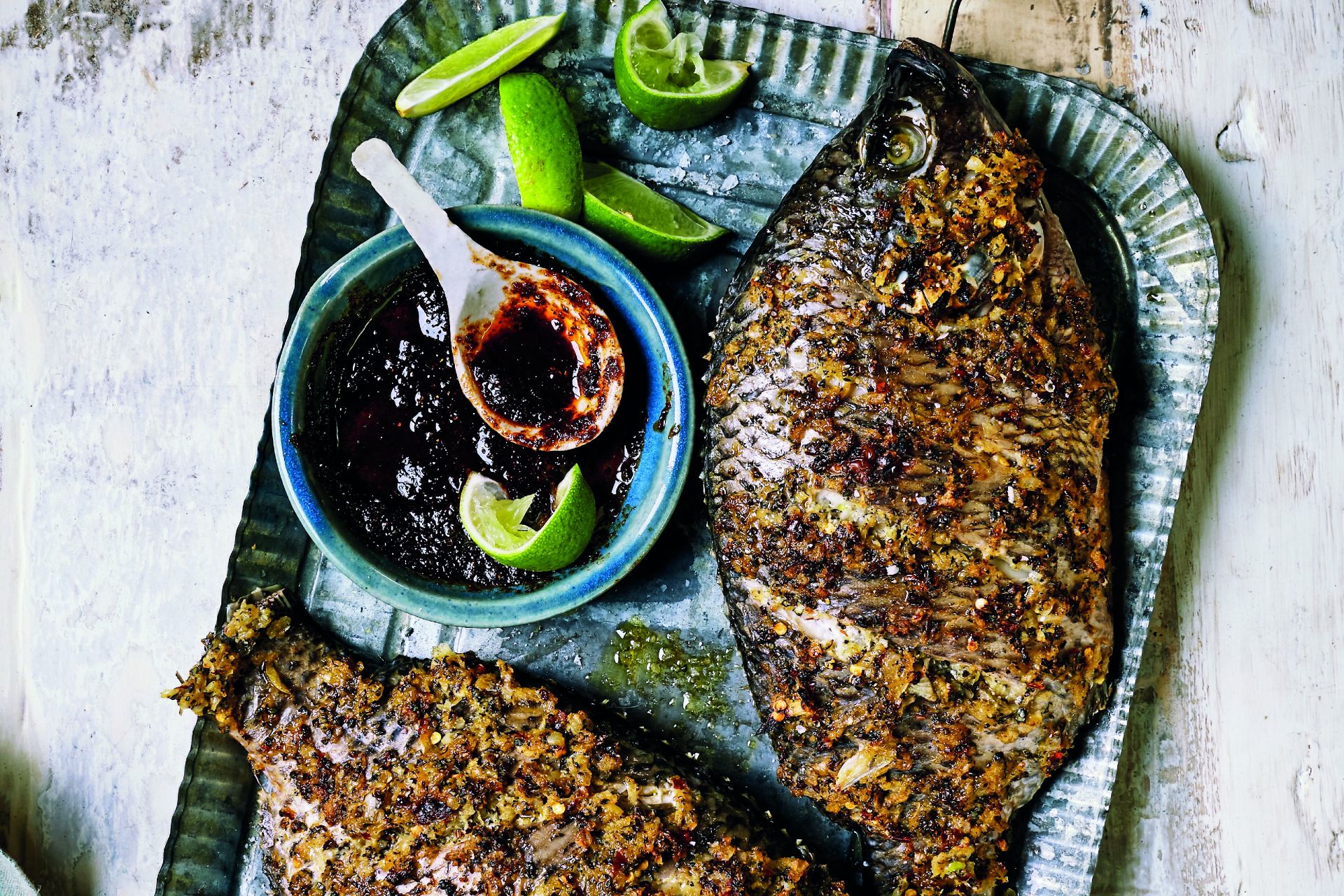 Pour the marinade over the fish, reserving a small amount for basting, and rub into the slashes and inside the cavity of each fish. Cover the dish with clingfilm and leave the fish to marinate in the fridge for at least 1 hour, preferably overnight.