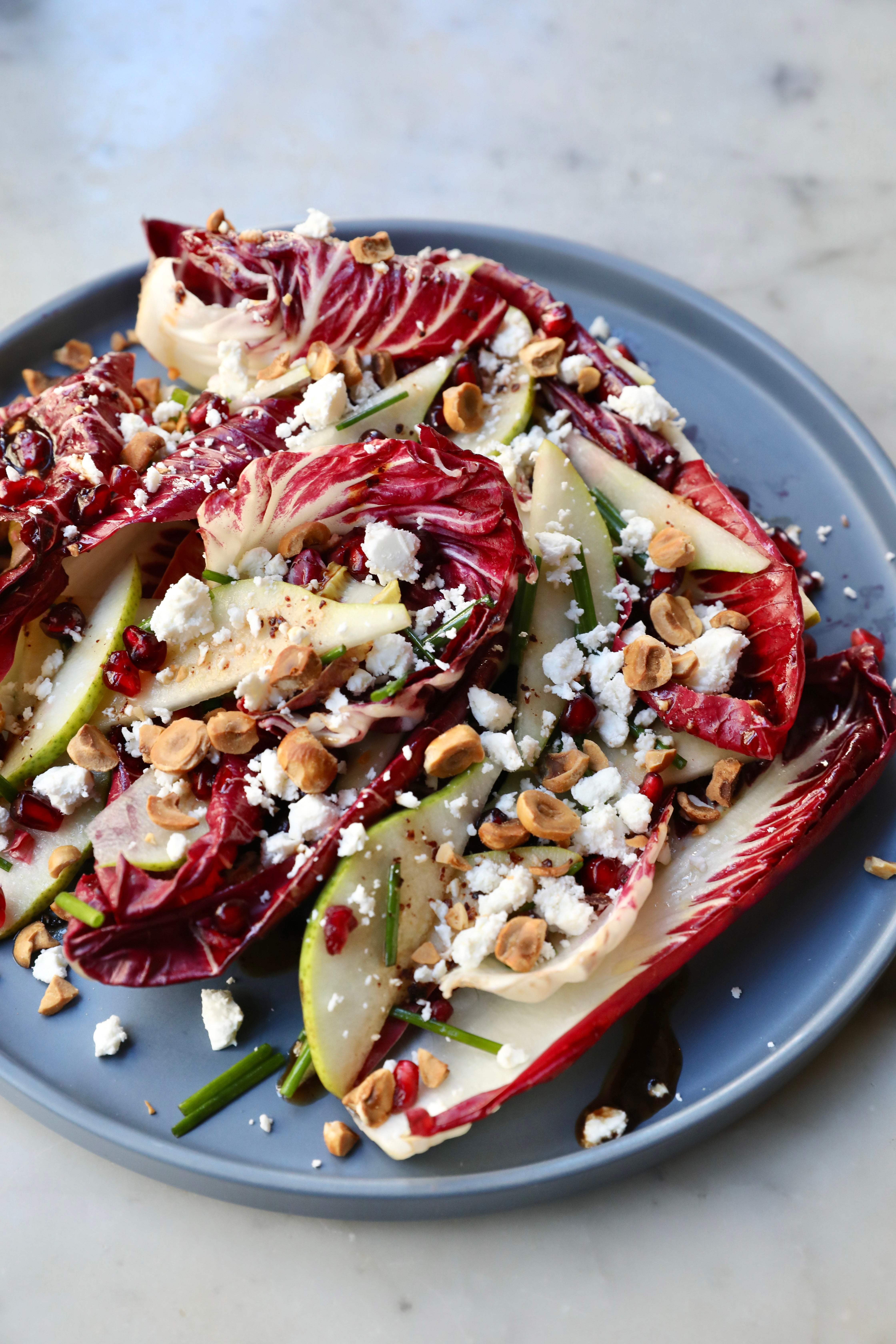 - Place the radicchio leaves and pear slices in a large bowl.