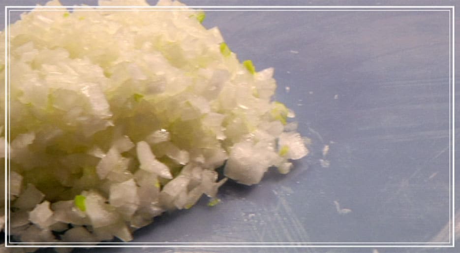 In this step, you will use a chef knife. Begin by cutting the onion in half, cut side down, on a cutting board. While holding the onion firmly by the root end, make vertical cuts running from the root until the tip of the onion. Make sure your cuts are evenly spaced and very thin. Now slice the onion crosswise. Hold the onion firmly, keeping the slices together, and make horizontal cuts into the onion. Once you are done, turn the knife into the vertical position and slice the onion. Gather all of your onion pieces and continue running the knife through them until they are small and even. You will need to do this several times. You should end up with very small cubes of onion.