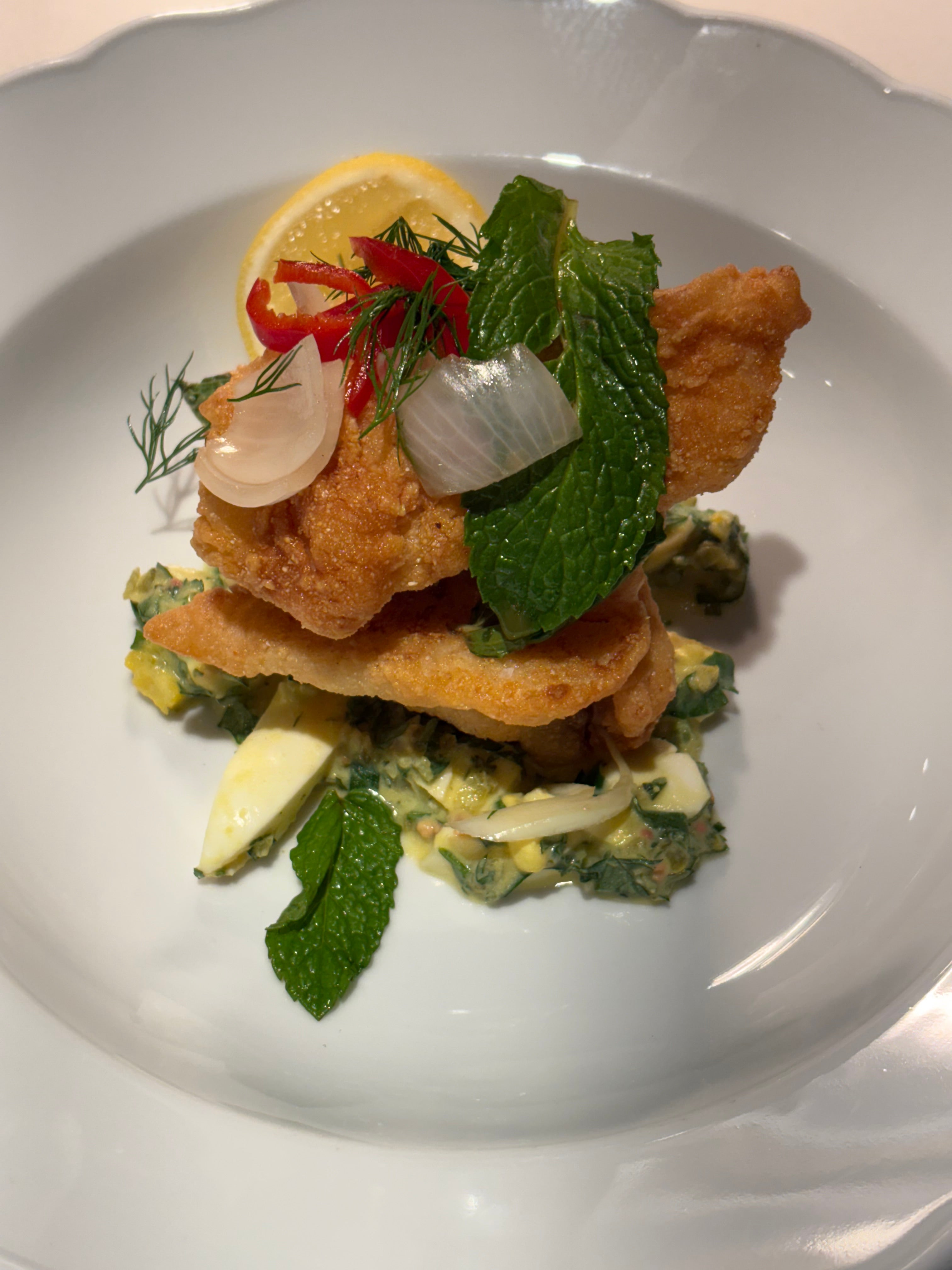 Crispy, golden-fried blue catfish meets a tangy, herbaceous sauce gribiche, bright pickled chilis, and a fresh herb salad in this elevated take on a Chesapeake classic.