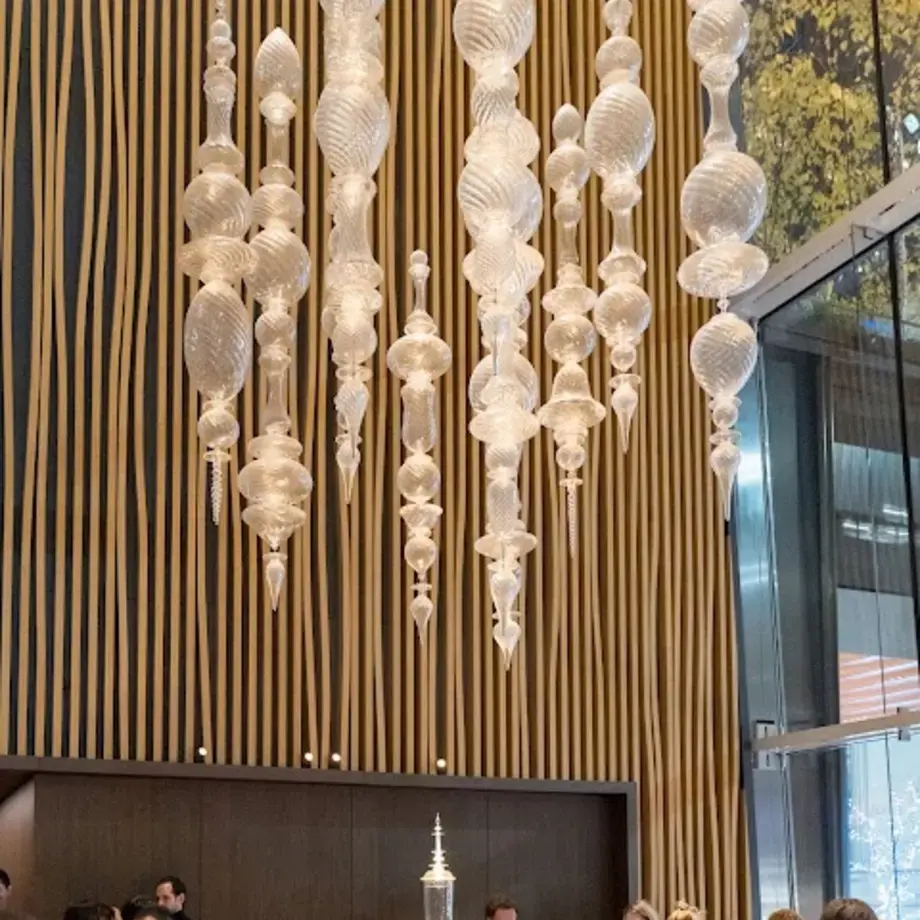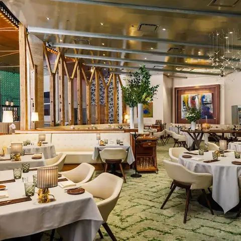 The modern, 80-seat dining room—set along the edge of Bryant Park—offers lunch and dinner, with various prix fixe menus, a chef’s tasting, and à la carte selections. The space is both grand and inviting, framed by rustic wooden beams reminiscent of Alsatian timber houses, abstract paintings, and a crystalline sculpture of 42 cranes suspended from the ceiling. The menu draws from Kreuther’s Alsatian roots, elevated by his French training and decades in New York’s top kitchens before opening Gabriel Kreuther in 2015.