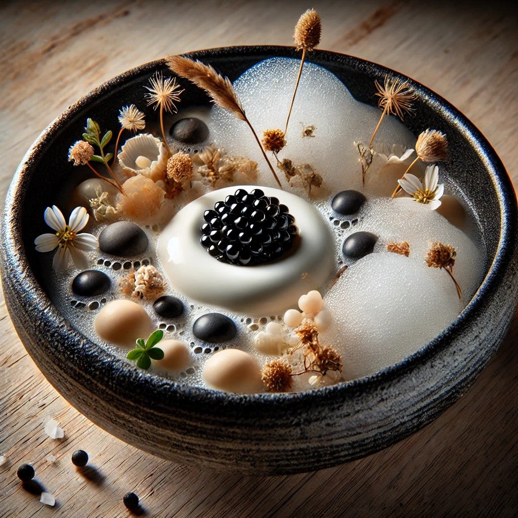 • The dish aims to present caviar in its most honest form—simply as fish eggs from the sea—while maintaining a luxurious experience through technique and high-quality ingredients. The rustic vessel and natural garnishes create tension with the refined caviar service, encouraging diners to reconsider their relationship with luxury ingredients.
